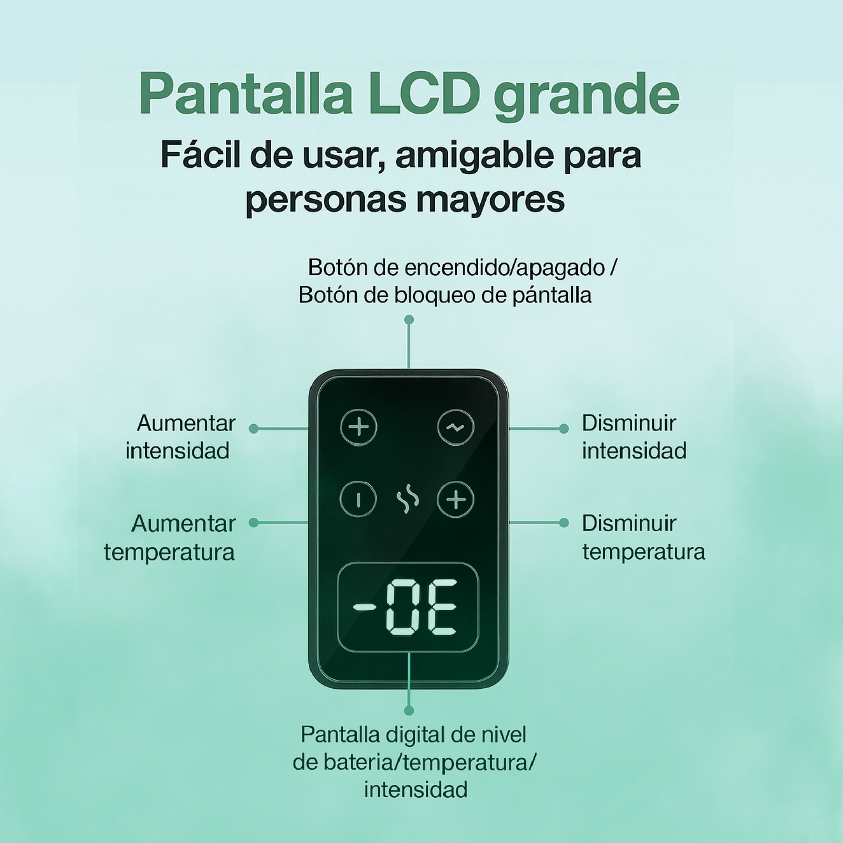 La pantalla LED de nuestra rodillera es tan simple que la dominarás desde el primer uso. Con íconos claros y botones táctiles, podrás ajustar el calor y la vibración en segundos, sin complicaciones. ¡Bienestar al alcance de tu mano!